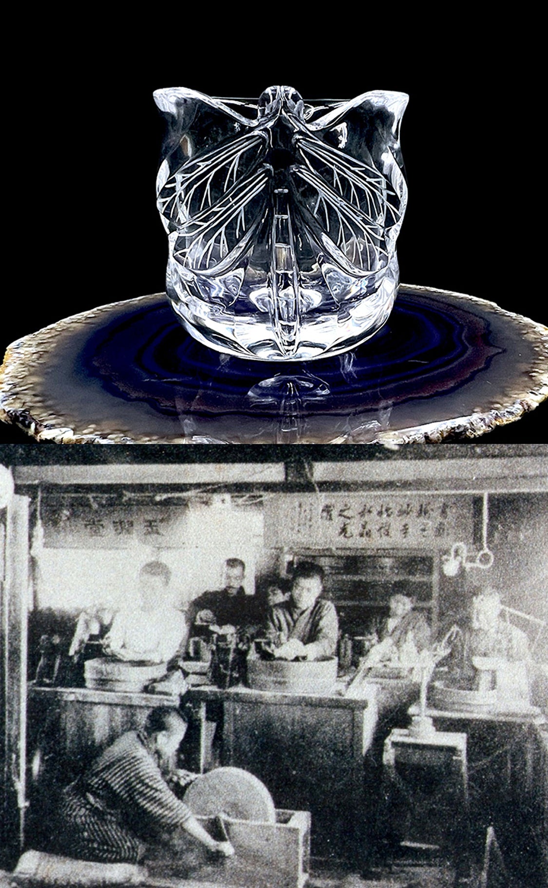 「幕末期の1867(慶応3)年に開催されたパリ万国博覧会には水晶を研磨した玉(ぎょく)などの作品を出品しています。これを契機に研磨やカッティングの技術が一気に進化します。明治後期に入ると動力化が進み、四代目華章がモーターで動く研磨加工用動力機械を開発すると、作業効率を大幅に上げることに成功しました。動力を用いることで研磨やカッティングの技術が一気に進化したのです」